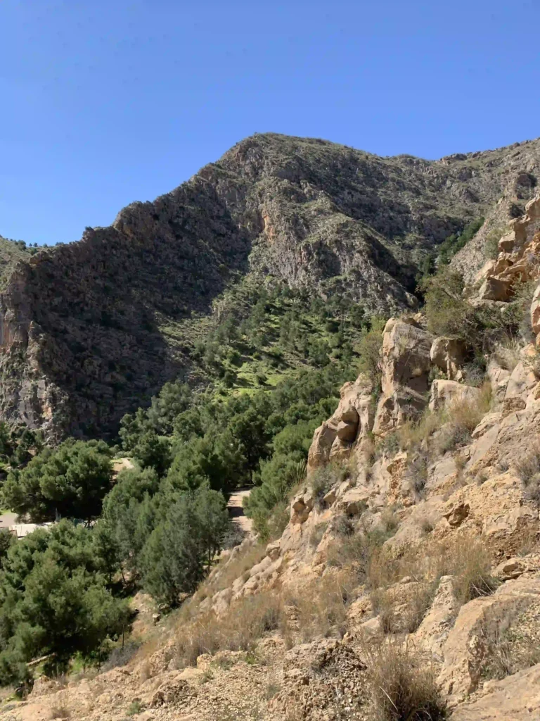 Ei mikään erityinen käppäilymaasto koirien kanssa, mutta polkuja vuoren rinteellä ja näkemisenarvoinen paikka ainakin ihmiselle. Upeasti kohoavat vuorenrinteet ympärillä. Hieman himottaisi lähteä valloittamaan niitä, mutta on äkkiseltään katsottuna sen verran jyrkkäseinämäisiä, että ei ihan kevyillä kenttävarusteilla ehkä mennä.